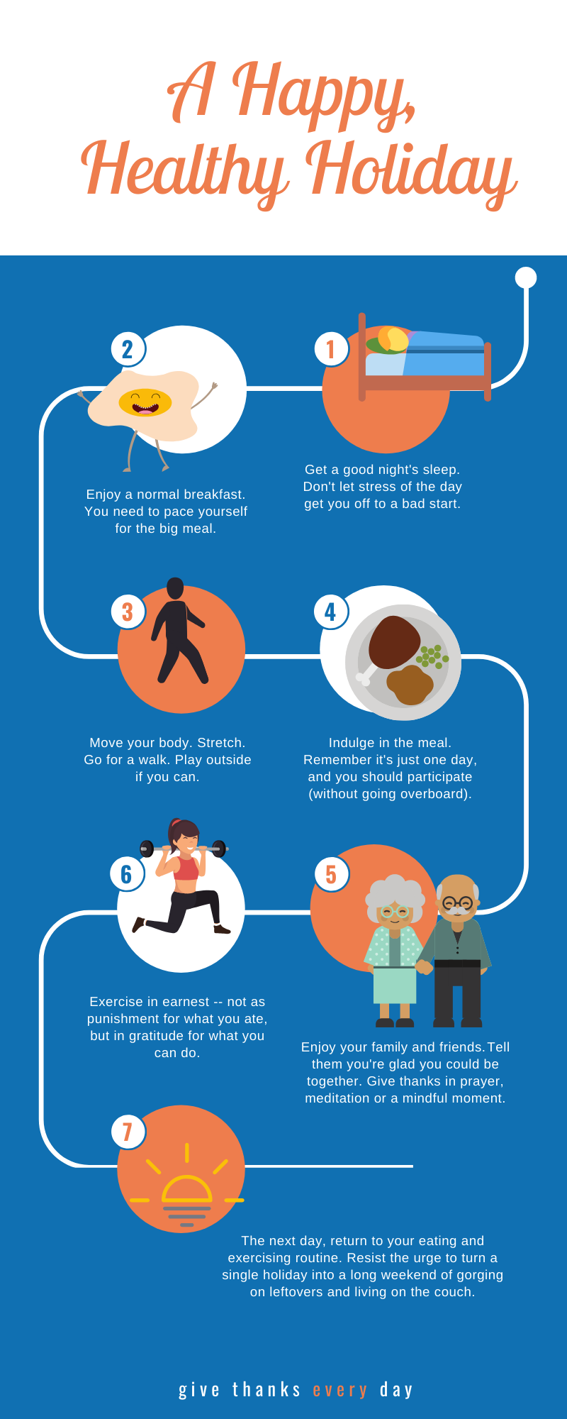 - Plan or limit the number of indulgences. One day here and there is okay, but don’t let it stretch into a week of overeating and napping