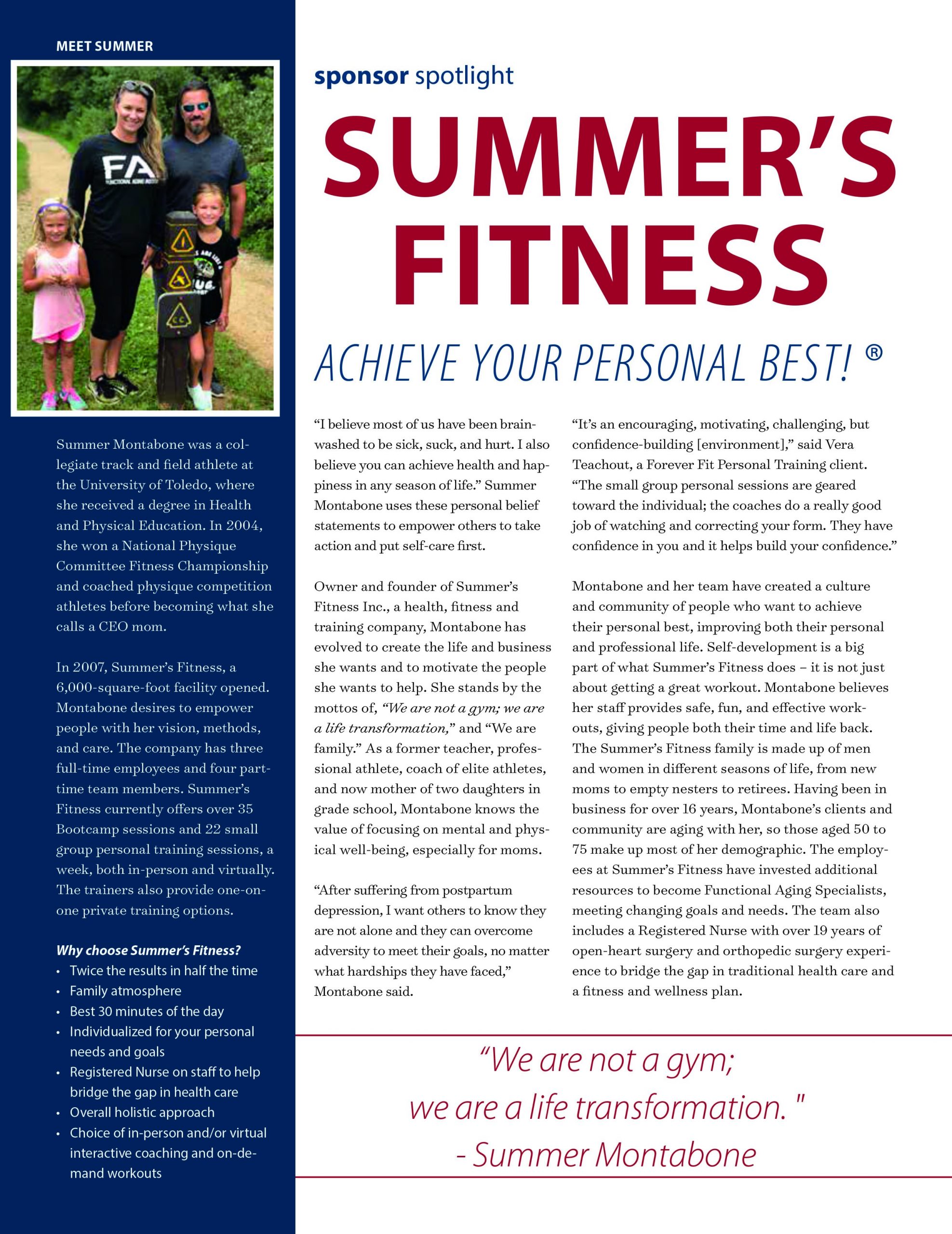 Owner and founder of Summer’s Fitness Inc., a health, fitness and training company, Montabone has evolved to create the life and business she wants and to motivate the people she wants to help. She stands by the mottos of “we are not a gym; we are a life transformation” and “we are family.” As a former teacher, professional athlete, coach of elite athletes, and now mother of two daughters in grade school, Montabone knows the value of focusing on mental and physical well-being, especially for moms.