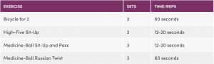 Two decades ago, the American Council on Exercise tested numerous abdominal moves using electromyography equipment to measure muscle stimulation — and the bicycle came out on top. Here, Aaron Viscounte, CSCS, PN1, head coach and manager at Summer’s Fitness in North Canton, Ohio, kicks the bicycle up a notch by adding a partner component.